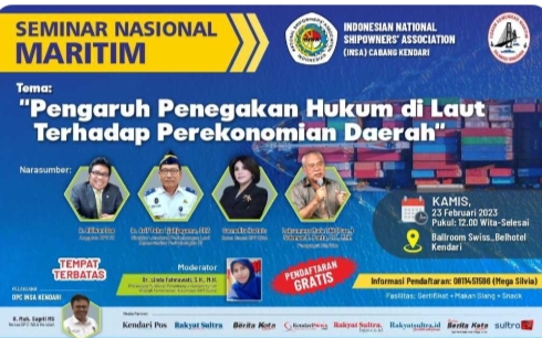 Dewan Pengurus Cabang (DPC) Indonesian National Shipowners’ Association (INSA) Kendari berencana  menggelar Seminar Nasional Maritim di Kota Kendari, pada Kamis 23 Februari 2023, bertema ‘Pengaruh Penegakan Hukum di Laut Terhadap Perekonomian Daerah’.