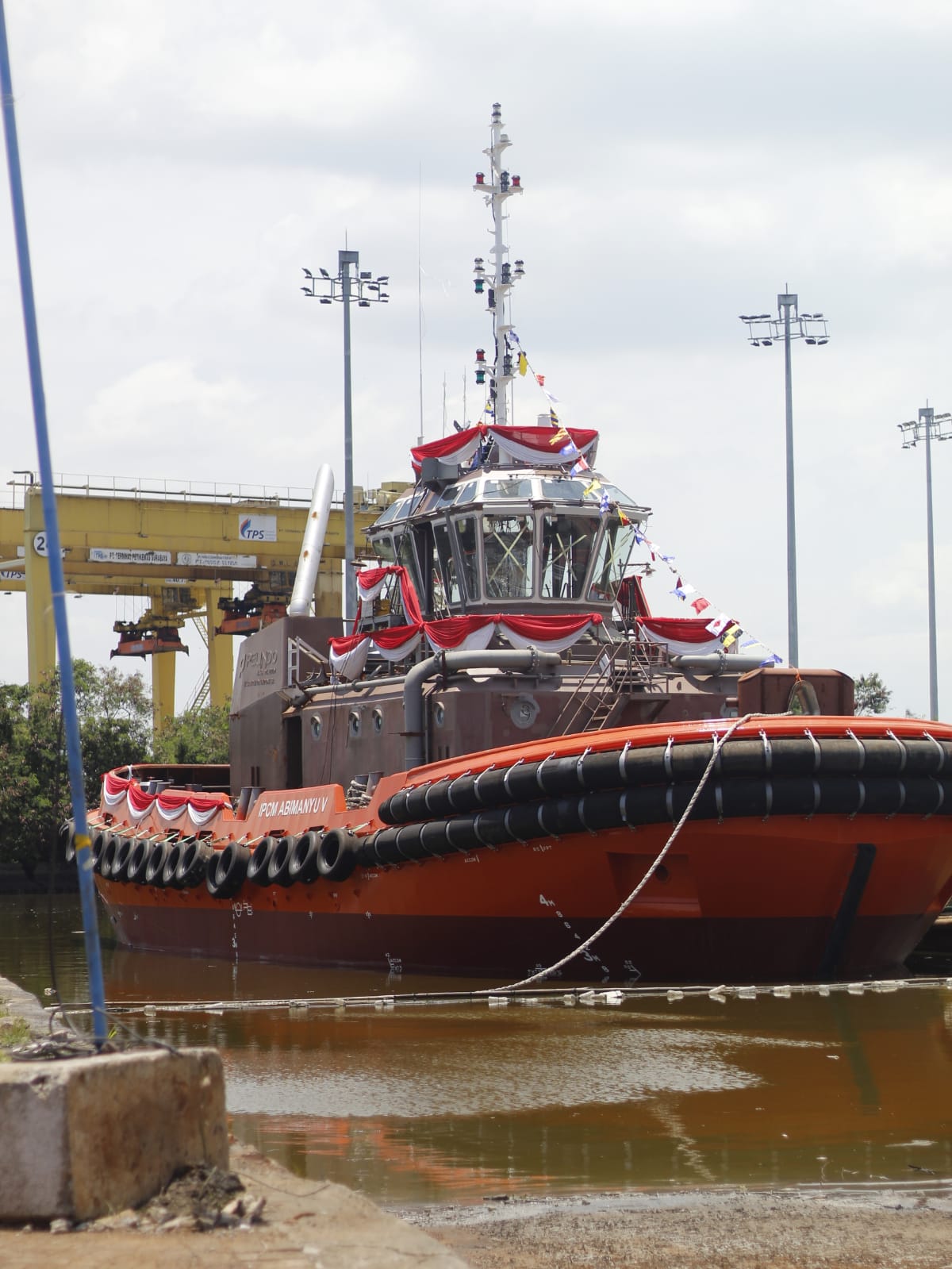 Peluncuran kapal tunda baru ini merupakan tahapan akhir yang menandai selesainya pembangunan struktur kerangka badan kapal.