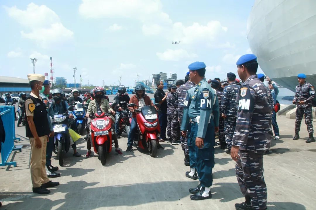 Ratusan pemudik arus balik berangkat dari rumah masing- masing dengan mengendarai sepeda motor yang akan naik Kapal Perang menggunakan KRI Banjarmasin -592 dengan Komandan Letkol Laut (P) Agung Ariwibowo.