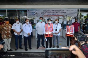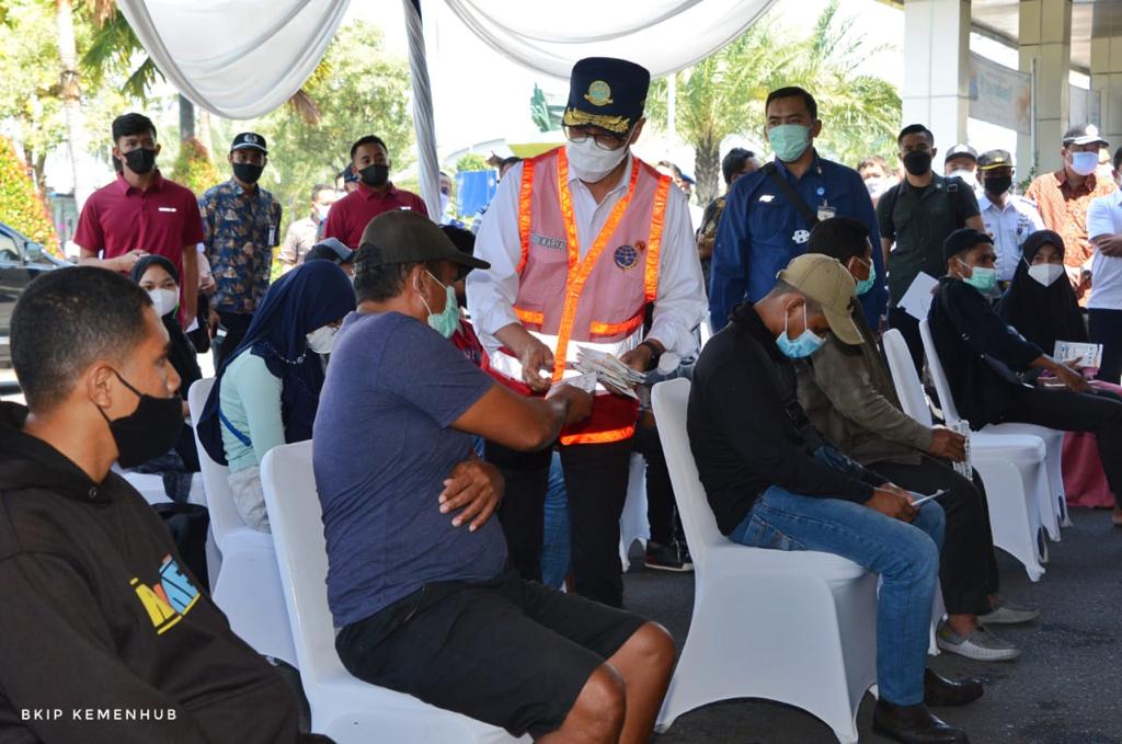 Pada kesempatan yang sama Menhub juga membagikan masker kepada para penumpang serta meninjau penerapan GeNose di Pelabuhan Tanjung Perak.