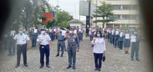 Para pejabat dilingkungan kantor Kesyahbandaran Utama pelabuhan Tanjung Priok, melakukan penandatanganan pakta integritas, perjanjian kinerja dan komitmen bersama pembangunan zona integritas menuju wilayah bebas korupsi (WBK) tahun 2021, bertempat di halaman kantor Syahbandar Priok, pada Rabu (17/2/2021).