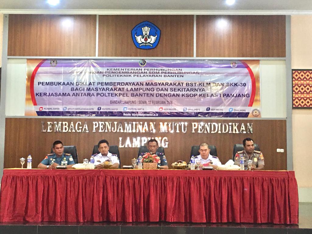 Bertempat di Lembaga Penjamin Mutu Pendidikan (LPMP) Propinsi Lampung, Kantor Kesyahbandaran dan Otoritas Pelabuhan (KSOP) Kelas I Panjang bekerjasama dengan Potiteknik Pelayaran Banten menyelenggarakan Diklat Pemberdayaan Masyarakat kepada awak kapal penangkap ikan tradisional (nelayan) dan awak kapal wisata tradisional berupa Basic Safety Training Kapal Layar Motor (BST KLM) sekaligus penerbitan Surat Keterangan Kecakapan berlayar sejauh 30 Mil (SKK 30 Mil) yang kegiatannya mulai berlangsung pada tanggal 17 Februari 2020 yang dibuka langsung oleh Kepala KSOP Kelas I Panjang, Andi Hartono.